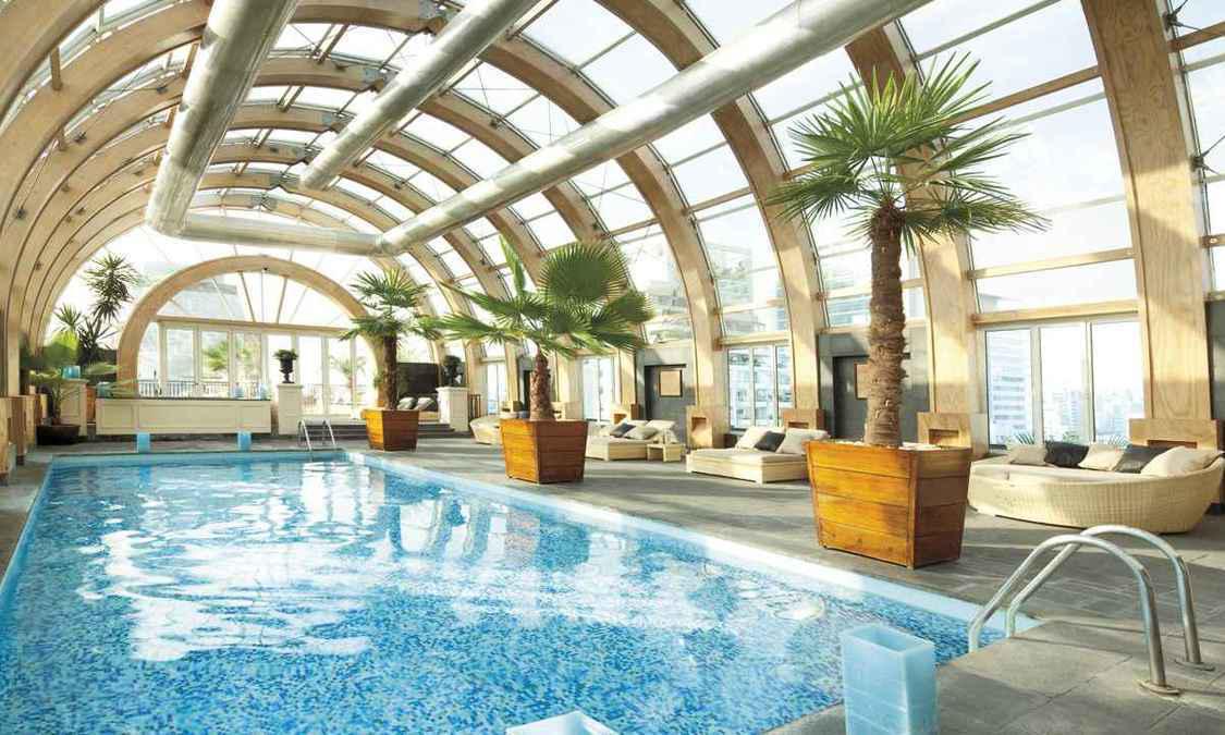 室内恒温游泳池和按摩浴缸,配有宽大的落地窗,可以俯瞰安第斯山脉和整座城市