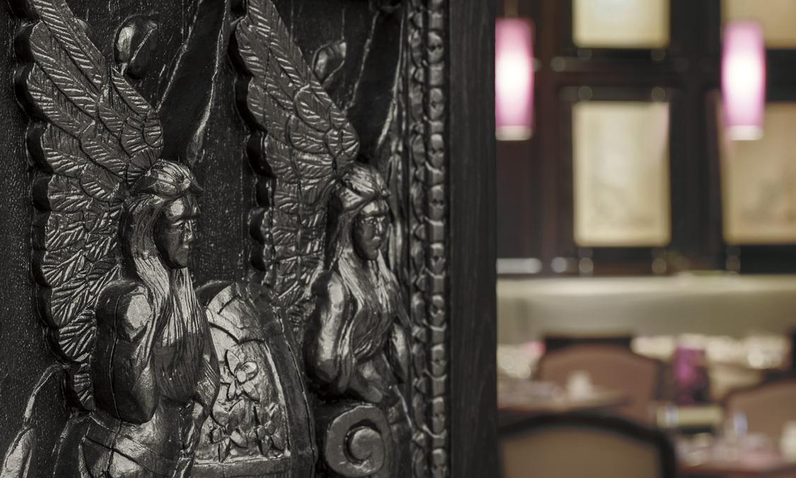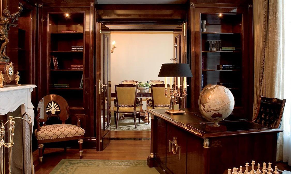 房间内部装饰有精美的黑樱桃木雕纹饰