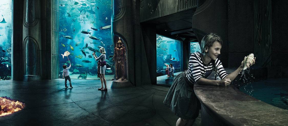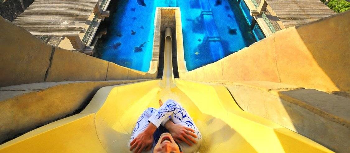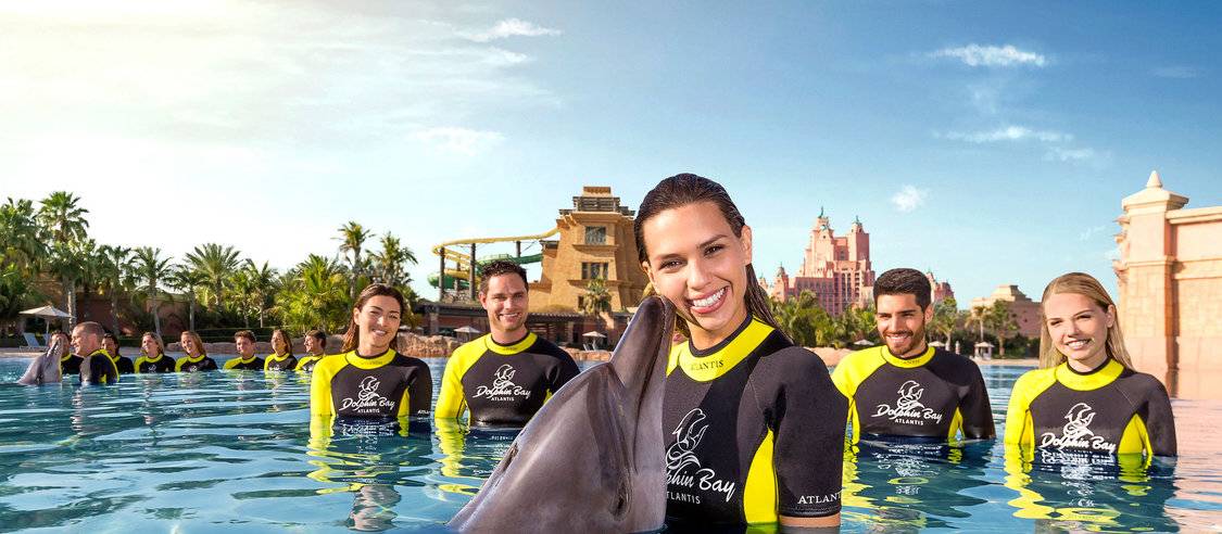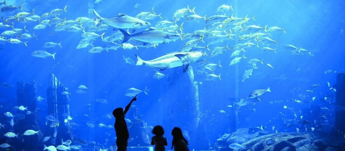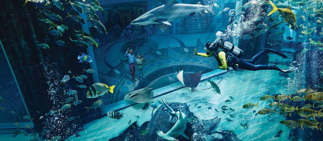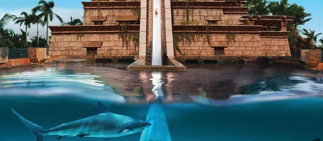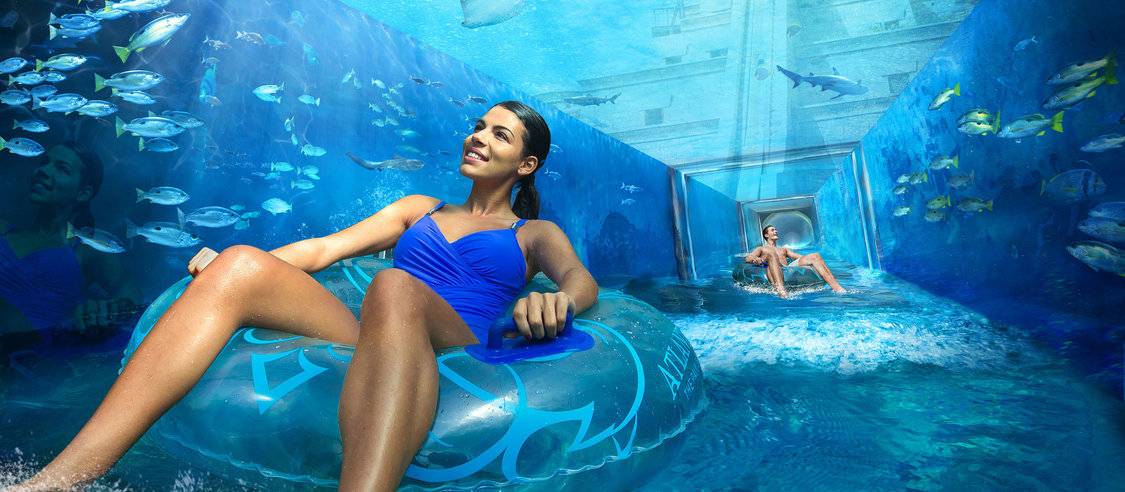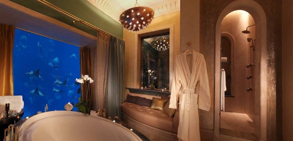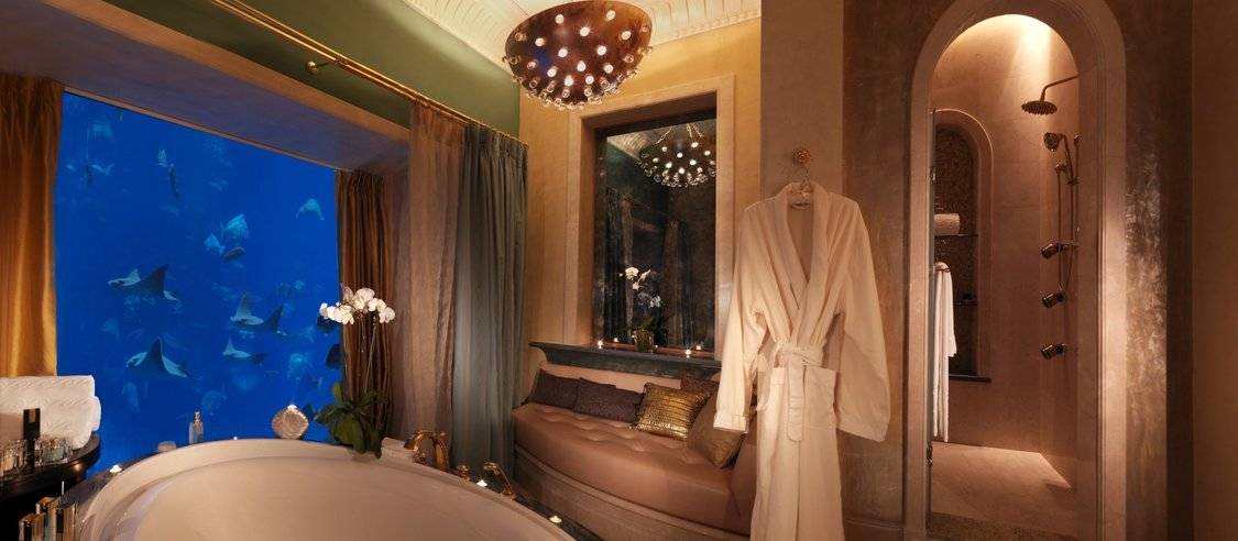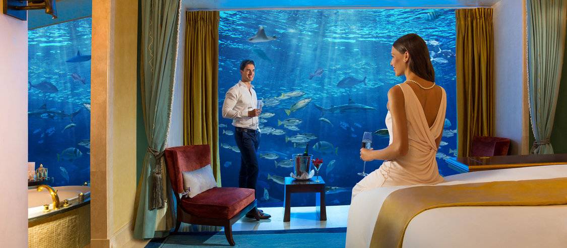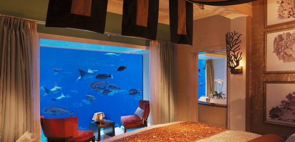 亚特兰蒂斯酒店(Atlantis),耗资15亿美元兴建,坐落阿联酋迪拜的棕榈人工岛上,占地113亩,有1539个房间,如同古波斯和古巴比伦建筑装潢风貌。2008年9月24日隆重揭幕,当中最贵的套房盛惠3.5万美元一晚,内有三间睡房和三间浴室,并有一张可供18人用餐的金叶餐桌,气派非凡。酒店的最大特色是大堂设有一个巨型水族缸,内里有6.5万条鱼。还有一个海豚池,饲养了20多条从所罗门群岛进口的瓶鼻海豚。