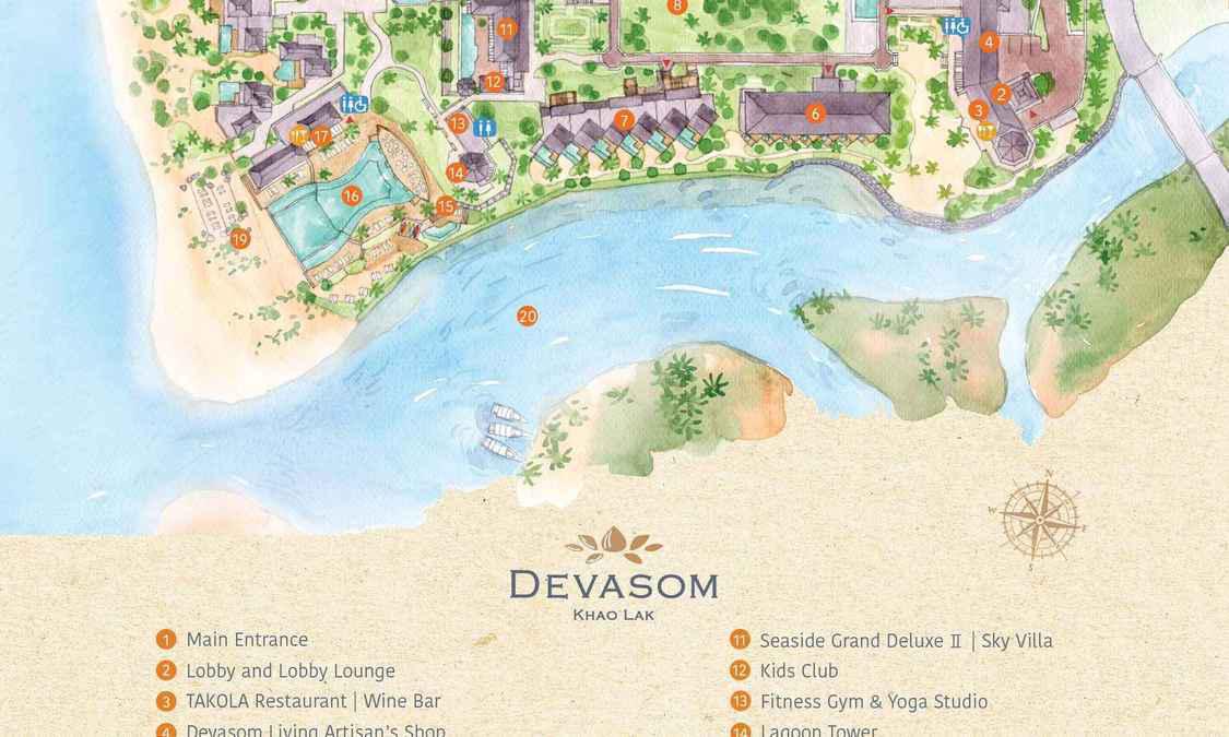 度假酒店提供奢华客房、泳池套房和海滨别墅,享有壮丽的海景,拥有古老东南亚建筑风格的装饰。客房和别墅均配有LED卫星电视、浴室设施以及大型私人阳台或带休息区的甲板。度假酒店每天补充免费室内迷你吧。客人可以在Devasom Spa and Wellness中心享受各种spa护理服务,或在24小时健身中心锻炼身体。度假酒店提供儿童俱乐部。Takola Restaurant and Wine Bar餐厅供应精选正宗泰国和西方美食。Devasom Beach Grill and Bar餐厅提供鸡尾酒酒吧以及融合了地中海风味的美食菜单,配有开放式烧烤架和燃木比萨饼烤箱。度假酒店还可以安排观景塔和海滨区的私人用餐服务,让客人尽享难忘体验。Devasom Khao Lak Beach Resort & Villas度假酒店距离拷叻(Khao Lak Town)有10分钟车程,提供往返拷叻的定时每日班车服务,距离普吉国际机场(Phuket International Airport)有不到75分钟的车程,靠近攀牙湾(Phang Nga Bay)和许多风景秀丽的国家公园和瀑布等景点。客人可以乘坐快艇轻松抵达西密兰群岛(Similan Islands),亦可乘坐皮划艇或骑自行车游览周边的水道。