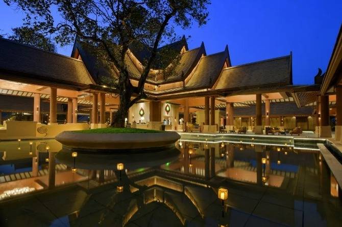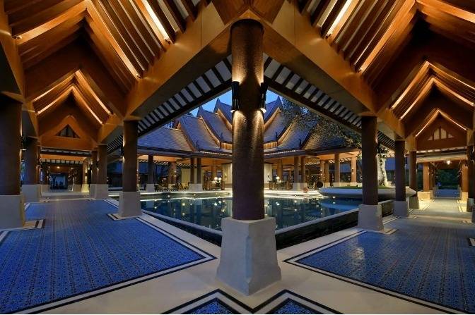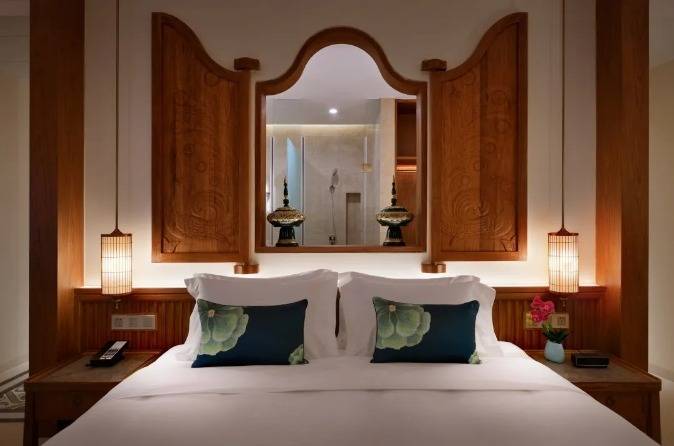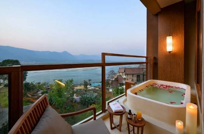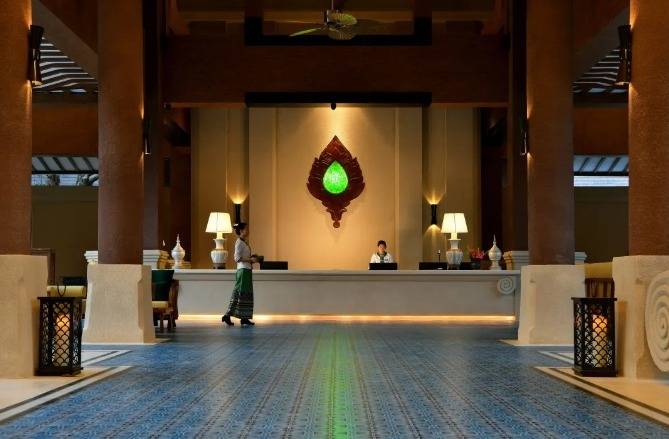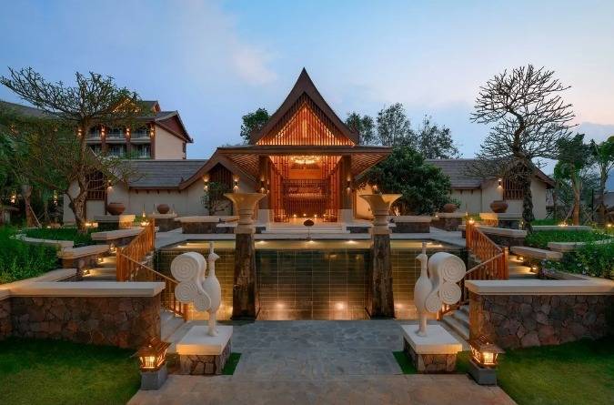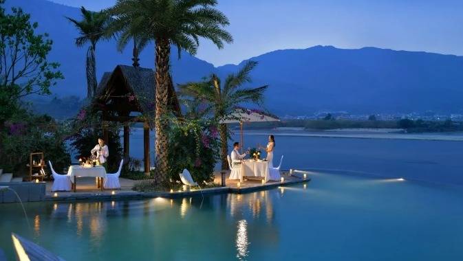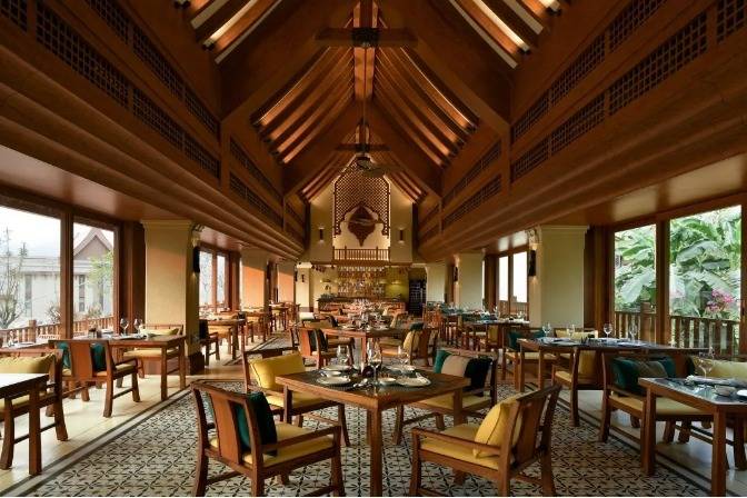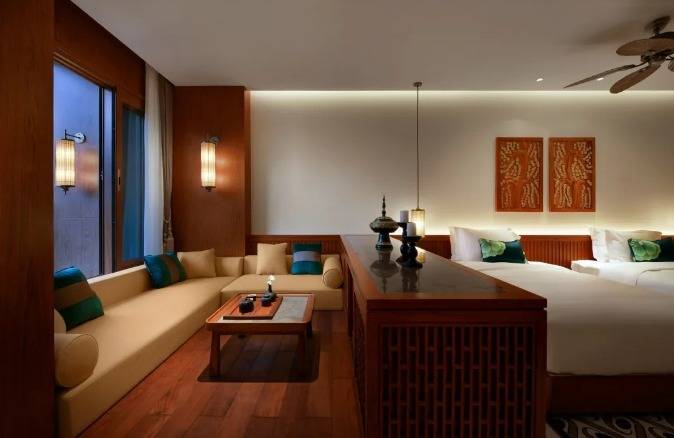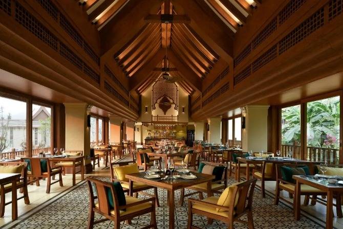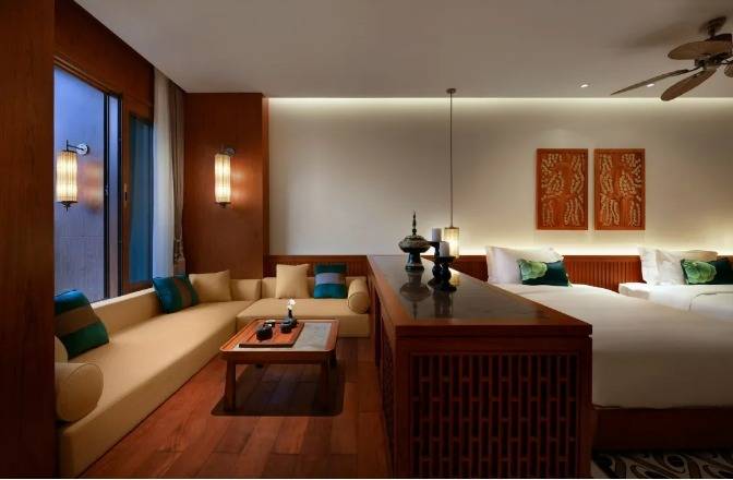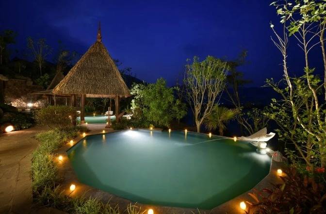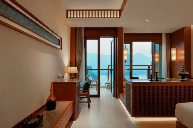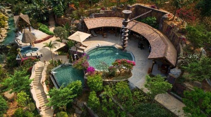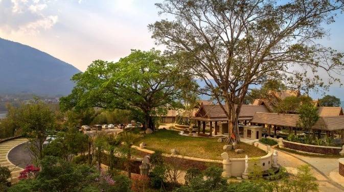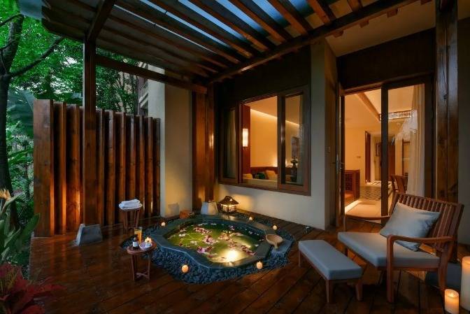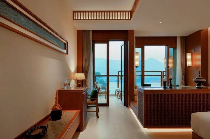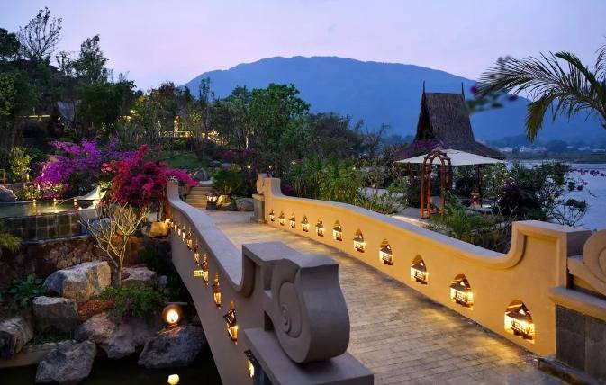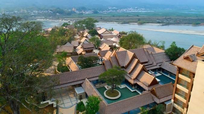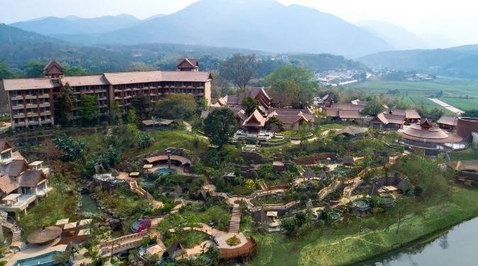 华江翡华金科温泉度假酒店选址于云南省西南边陲小镇,位置脱离城市喧嚣,占地面积5万多平米,紧邻瑞丽江南侧,村落、稻田、河流、山脉尽数纳入视线,景观资源极佳。更有独特的峡谷式亚热带雨林风的主题温泉,亦造就了特别的休闲度假空间。酒店整体建筑形态体现了当地民族文化与东南亚民族文化的融合,继承了自然、健康和休闲的特质。 酒店还保留了现场原有的2棵百年高山榕屹立在入口两端。在设计上巧妙的运用了现场原有的树木,使得百年老树得以保留不被破坏又给酒店增添了一层更深厚的历史文化底蕴。而它们更像是在守护着这一方土地。当客人进去酒店大堂时,入口处的铜锣便会被敲响,这给客人入住的体验更增添了一些仪式感。而长廊的订制吊灯在灯光的照射下映射出树枝婆娑的光影。每一个设计细节都是为了给客人带来一种更丰富的度假体验。餐厅架落在峡谷之上,而餐厅下面水流的蜿蜒流动如同纽带,串联起了室外空间的新媒体。桥餐厅的两侧均是落地玻璃推拉门,大幅引入周边景观让两侧景观相互贯穿,使室内与景观还有光线无限融合。客人在用餐的同时可领略秀美的亚热带雨林峡谷风情。 酒店设有100间客房包含15套VILLA。所有客房阳台配备私人温泉泡池,拥有精心设计的开放式格局和充足的自然光线。室内空间多运用缅甸的柚木,这种柚木带有一种特别的自然香味,对人的神经系统起镇静作用,且视觉上更有厚重感。酒店以特色温泉为打造亮点,共22个泡池。每一个泡池都直面瑞丽河且都有它独有的名字与功能,是世界稀缺型偏硅酸型温泉,对人体益处颇多。